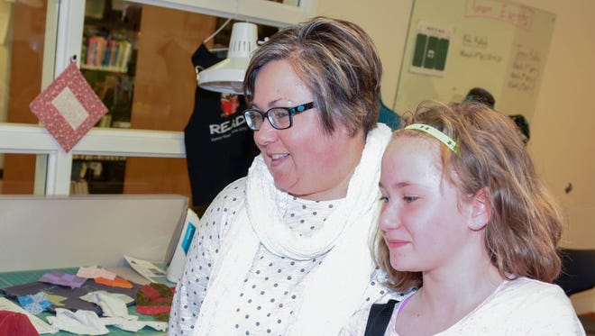 Library mentor Sharon Lesan (left) demonstrates the new digital sewing machine to Katie Ernst and her daughter Liz, 11, a fifth-grader at Northwest Elementary, in the new Hatch, a makerspace at Kirkendall Library, on Tuesday, March 31, 2015.