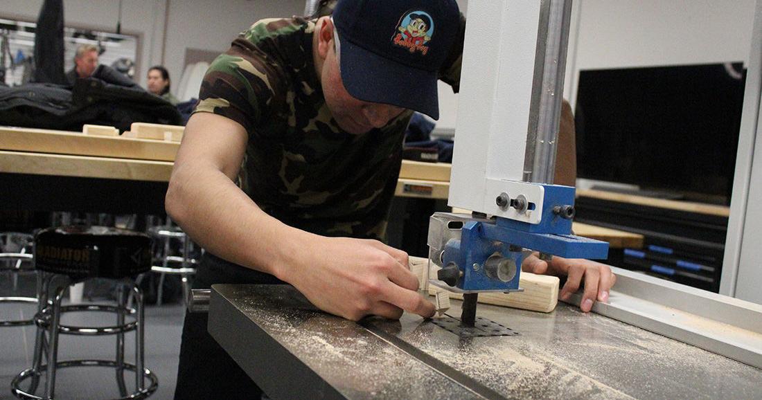 As another student carefully lined up a hand saw against a piece of wood for a tabletop, two more students walked in the door and set themselves up at an open desk space with a single plank of wood and a laptop viewing a 3D model.