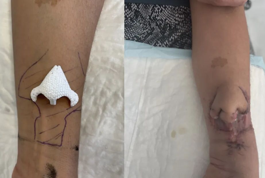 The patient's forearm and 3D bioprinted nose. Photo via Toulouse University Hospital.