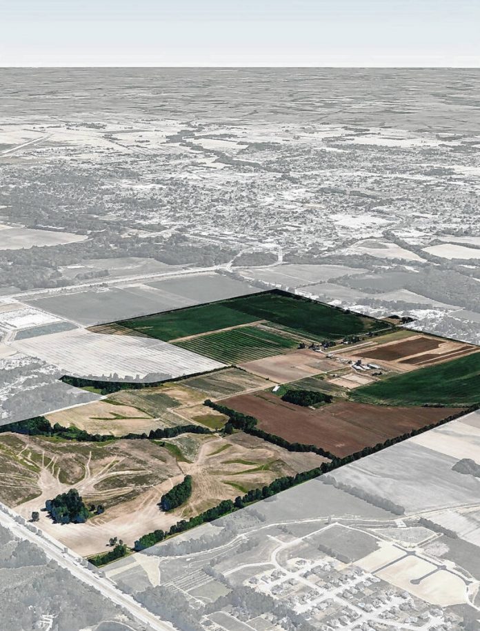 An aerial view of a nearly 700-acre development site for a future Columbus Regional Hospital facility and various other development is shown. The site is south of State Road 46 between State Road 11 and Interstate 65.