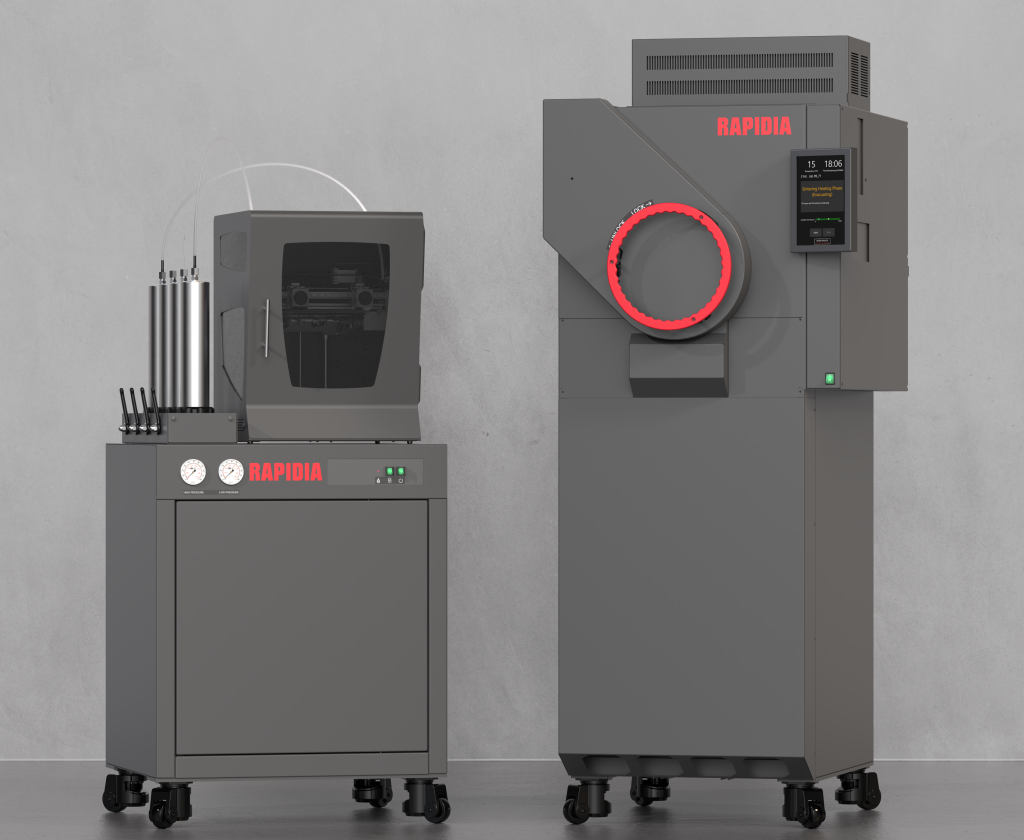Rapidia’s two-part 3D printer and furnace system enables the layer-by-layer deposition of a unique water-based metal paste into complex parts, which don’t require debinding before sintering. Having given the compact machines behind its rapid manufacturing process a physical European debut at Formnext, the firm now plans to bring it to market there during the first quarter of 2023.