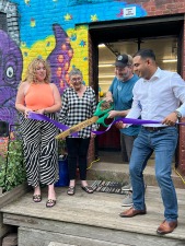 The Print Shop Managing Director Jeff Bianchine (center right) cuts the ribbon with Mayor Joshua Garcia (right), Greater Holyoke Chamber Executive Director Jordan Hart (left), and Holyoke Art member Kathy McKean (center left) alongside.