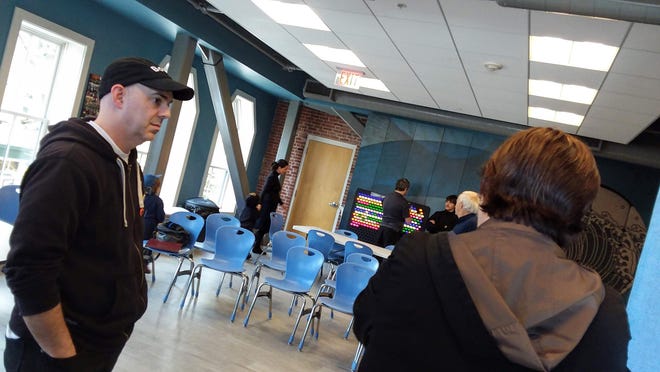 Artist-in-residence Dan Borelli speaking with guests to the Corson MakerSpace on Saturday, 27 in New Bedford. [Steven Froias/The Standard-Times/Special]