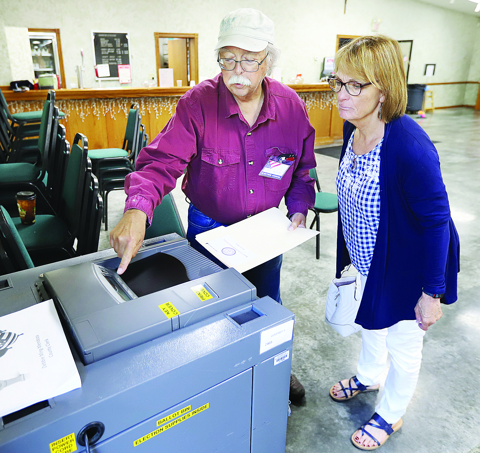 Inside the Godfrey Knights of Columbus, 1713 Stamper Lane, Godfrey, election judge Clement Williams, left, helps a voter cast her ballot in Godfrey Precinct 2 in a previous election.