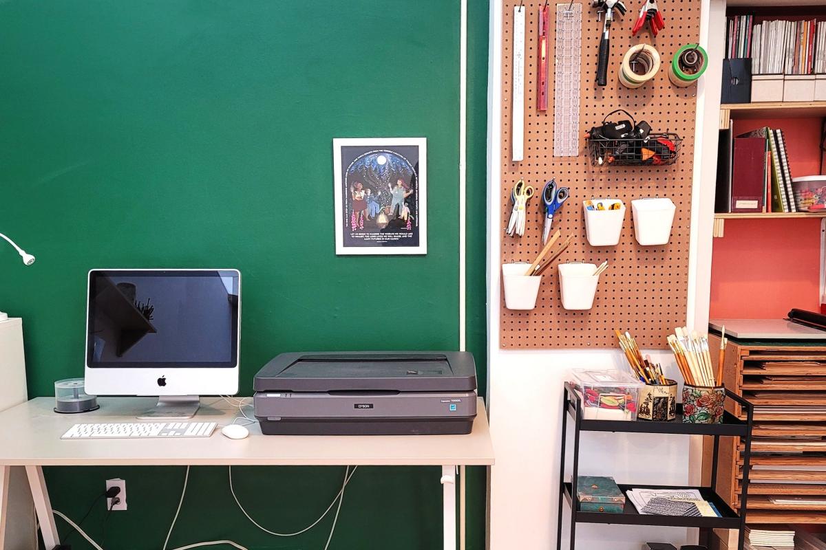 Artspace Peterborough's new maker space has a range of equipment and tools and materials available, including a 2023 IMac with Adobe Creative Cloud and a large Epson flatbed scanner. Drop-in hours on Fridays and Saturdays begin on March 10, 2023. The space is free to use for Artspace members and $5 per day for non-members, with art-making materials available at cost. (Photo: Artspace Peterborough)