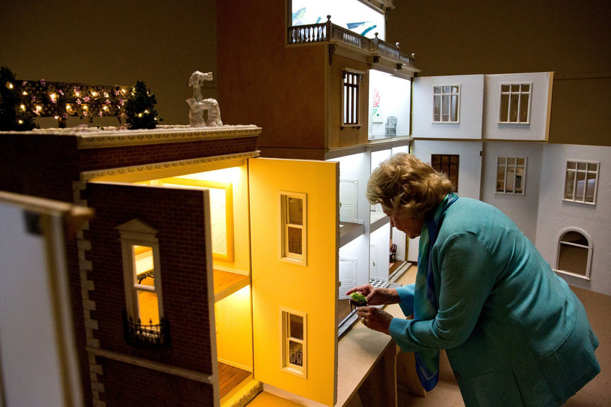 Lucy Bassett Andrews with her dollhouses, on view beginning June 7. Image courtesy of Lighthouse ArtCenter