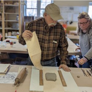 Jim Cusamo of Dublin, center, at a recent slab-made tiles workshop at the MAXT Makerspace Dublin Ceramics Center.