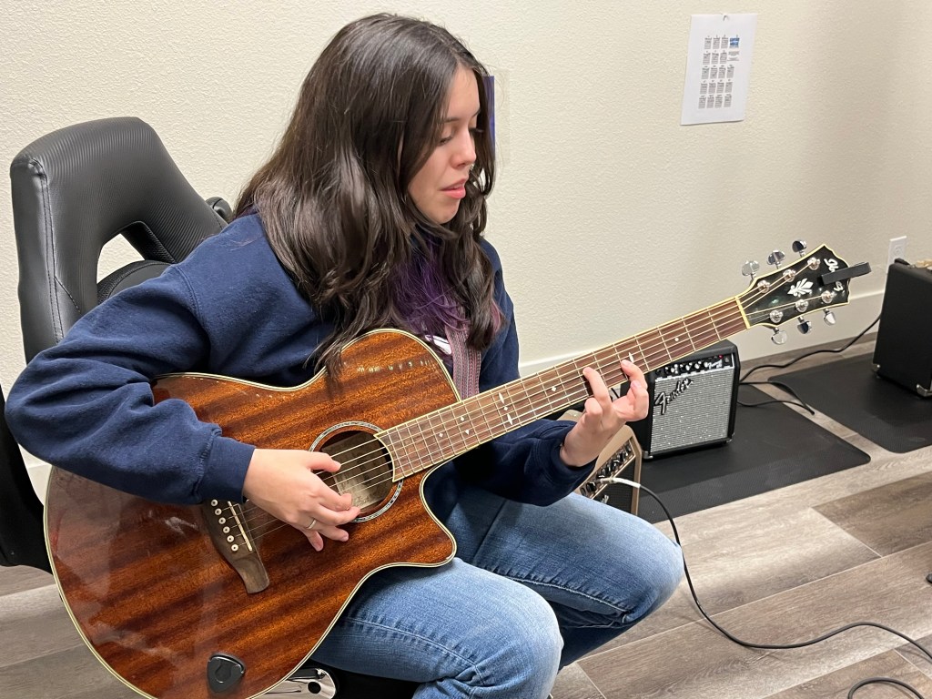 Danielle Busby, 16, strums a guitar in the music room Thursday, Nov. 9, 2023 at the newly remodeled Paradise Teen Center in Paradise, California. (Jennie Blevins/Enterprise-Record)