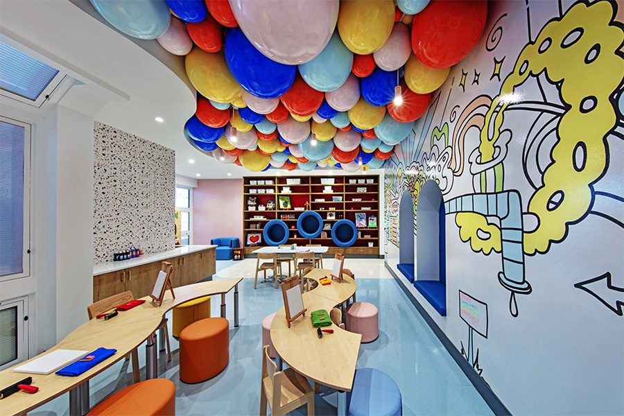 Eager to introduce such an uplifting sanctuary, St. Jude, in collaboration with the pharmaceutical company AbbVie, tapped New York- and Miami-based design firm ICRAVE and local practice ANF Architects to imagine the 45,000-square-foot St. Jude Family Commons spanning one floor of the original hospital.
