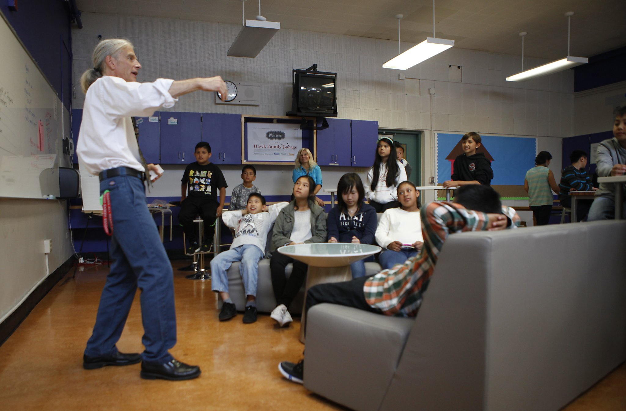 Paul Vignaux, math teacher at Hoover Middle School, explains some of the new equipment in their new Makerspace, named Hawk Family Garage, during a sixth grade class session on Friday, Aug. 21, 2015 in San Francisco, Calif. The school received a $100,000 grant from Salesforce to spend however they wanted.