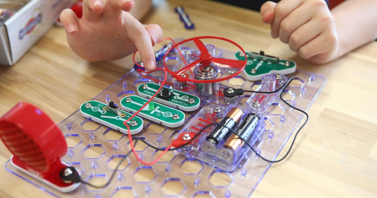 Lehigh Carbon Community College dedicated its new STEAM makerspace at LCCC Tamaqua in a ceremony April 13. Funded through the college’s SHINE after-school program, the makerspace is housed in an innovative, newly customized classroom in the Morgan Center. The STEAM makerspace is designed to promote collaboration and provide a space for hands-on, experiential learning that highlights the real-world application of academic lessons. ABOVE: Alyssa Mincavage, 8, and Maddie McGlinchey, SHINE teacher, build with cubelets during the ceremony. LEFT: Trinity Chalk, 8, left, and Brennan Reigel, 8, work to send a disc into the air they built using snap circuits.