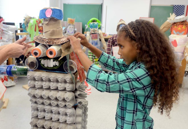 Third-grader Camrynn Cross, 8, attaches hair onto the classroom scarecrow at Moosup Elementary School's Makerspace room.