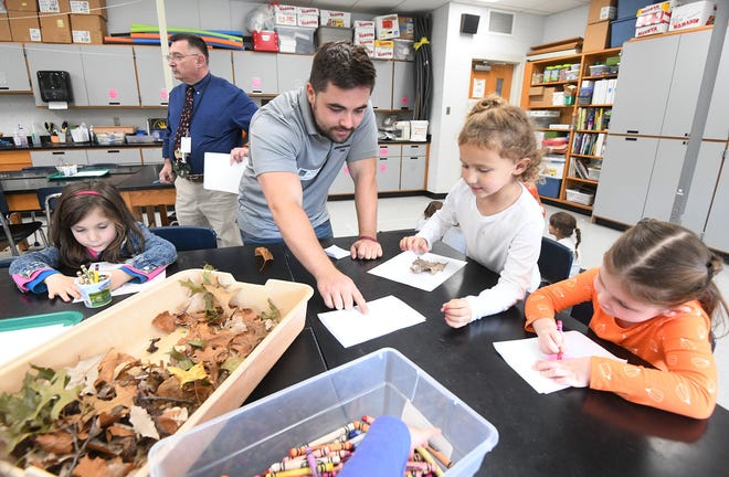 Colby Coombs, CFO at Westminster Tool in Plainfield works with kindergarten students Clementine Farrow, left, Alexis Hommand and Alaina Mineau October 25, 2022 at Moosup Elementary School. In background is principal Bill Nagel. Coombs works with students there providing them guidance about a possible career in manufacturing.