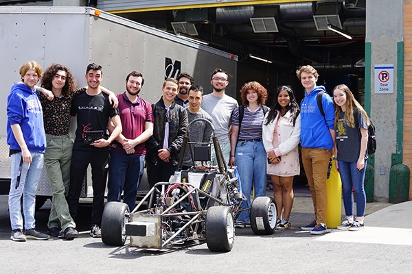 “They’re called catch cans. If the coolant overflows, it can go into the can,” explains junior mechanical engineering major Aaron Bouchard, president of River Hawk Racing, the student club that is UMass Lowell’s chapter of SAE International (formerly the Society of Automotive Engineers).