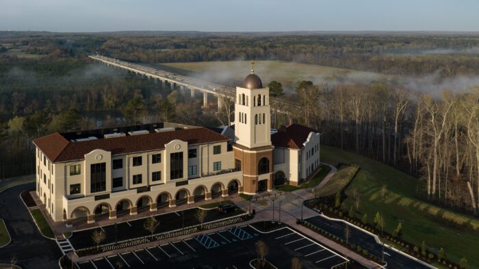 The three-story, 49,000-square-foot Saint Gertrude school overlooks the James River near state Route 288’s World War II Veterans Memorial Bridge and features 18 classrooms, a large communal space called the Great Hall and a dedicated dining hall, among other facilities.