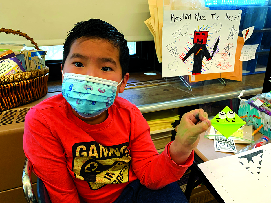 School media specialist Ann Tracy assembled 300 individual makerspace kits with materials for origami projects, paper snowflakes and several types of bookmarks. She then distributed them to in-person students during library class and mailed the kits home to remote learners. Students were also able to complete additional projects during indoor recess by following the instructions on Ms. Tracy’s Google Classroom.