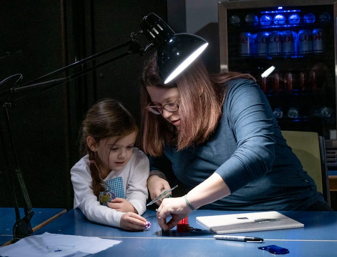 Jan 27, 2023; Tuscaloosa, AL, USA;  Druid City Makerspace has a wide variety of tools and supplies for crafts. Members can use high tech equipment at the business on 23rd. Ave. in Tuscaloosa. Owner Tiffany Amirkhanian cut glass for a future project as her daughter, five-year-old Aislinn watches.