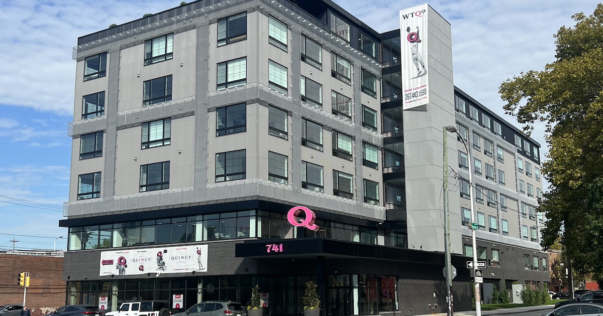 Q the funk: that neon sign atop the entrance to The Quincy, on Spring Garden Street at Poplar’s southern edge, signals that what’s inside will be more colorful than what you see here. / This photo by Craig Grossman, Arts & Crafts Holdings; all other photos by Jin Wu via Arts & Crafts Holdings