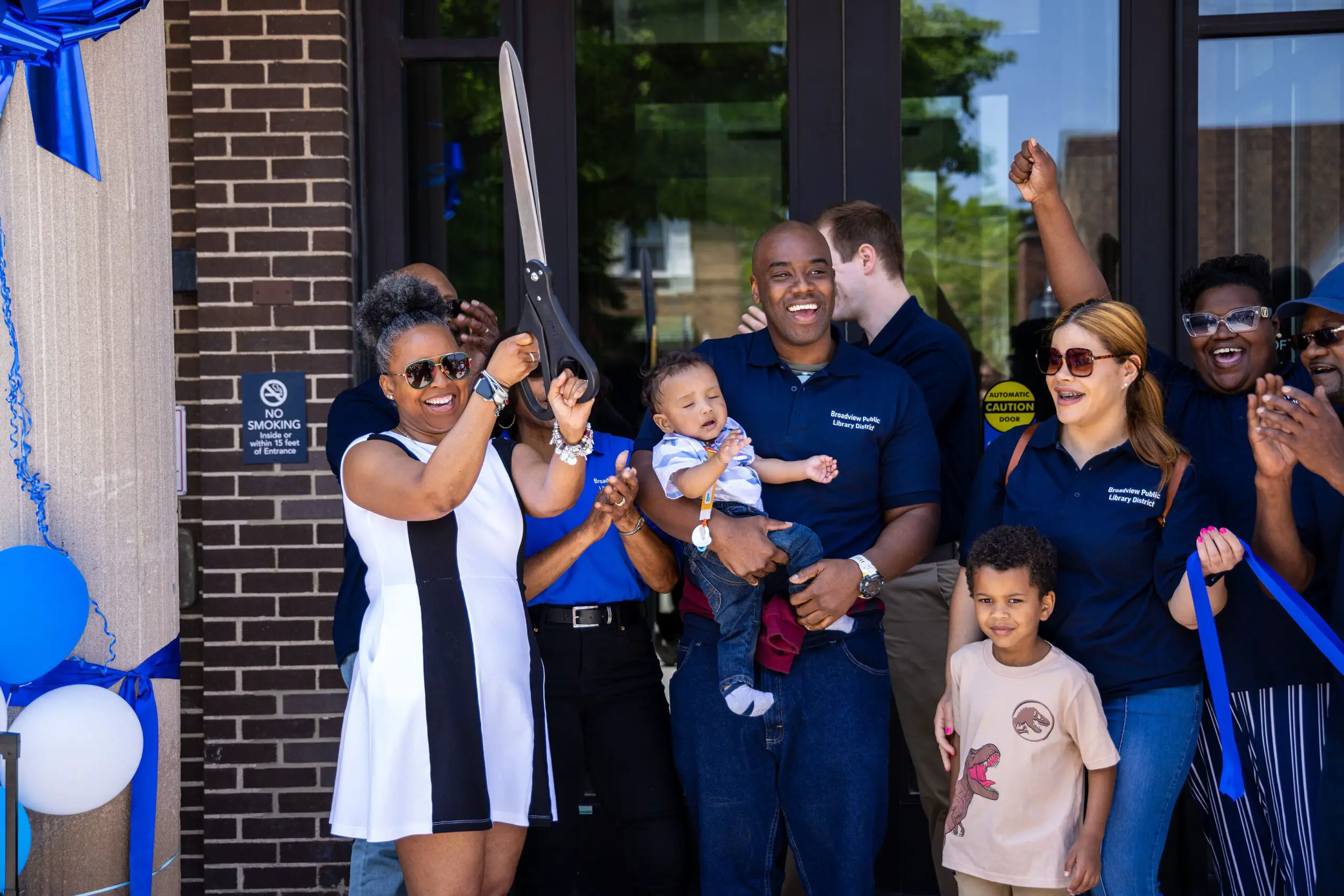 Mayor Katrina Thompson and staff celebrating the reopening of the Broadview Public Library. | Sara Janz
