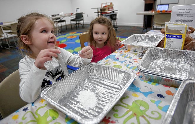 One Wednesday a month from 4 to 5:30 p.m. at the Lane Road Library, the door to the downstairs meeting room stands open and children, some in kindergarten or younger, wander freely in and out and among several stations.