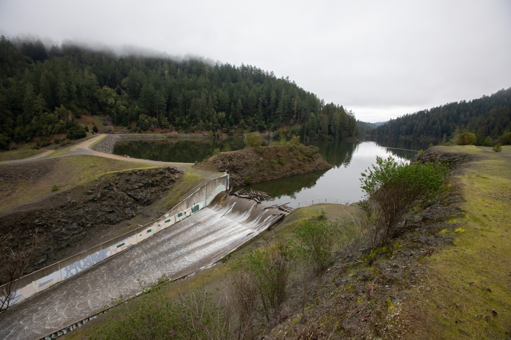 Water rushes down the spillway at Peters Dam at Kent Lake near Lagunitas on Jan. 6, 2022. (Douglas Zimmerman/Special to the Marin Independent Journal)