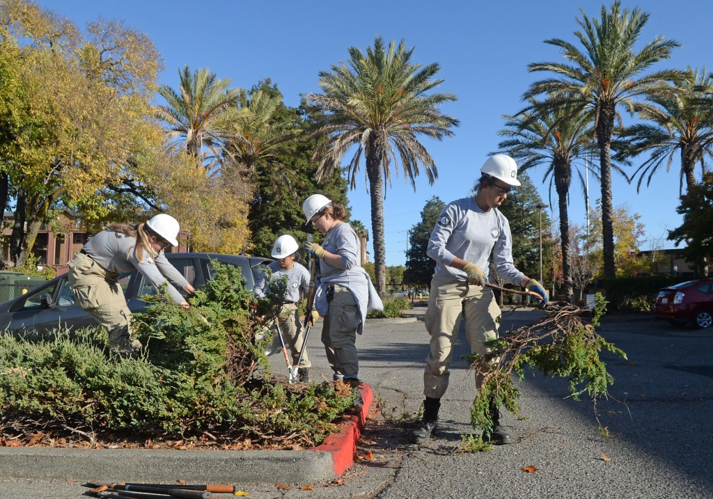 AmeriCorps members remove juniper bushes in the parking lot of the San Rafael Community Center. The work is in preparation for creating a fire-resistant garden. From left are Heather Byle, Emma Lucier, Kimberly Conforti and Tracy Burton Bravo. (Alan Dep/Marin Independent Journal)