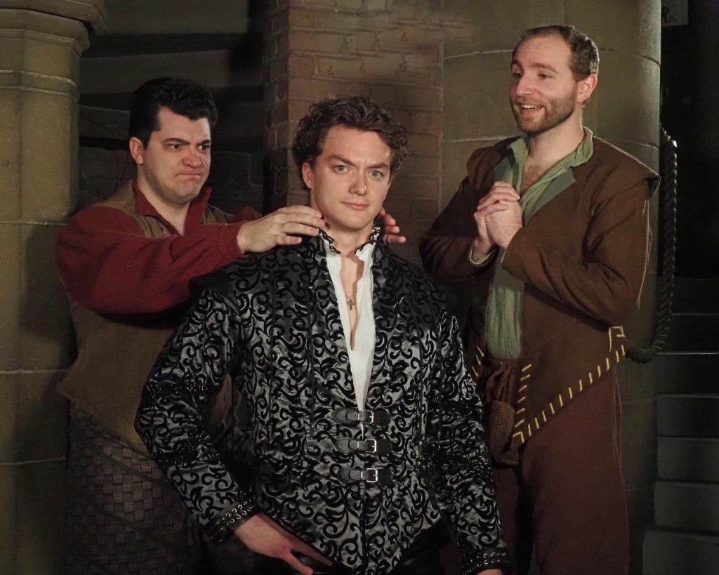 Mario Simone as Nick Bottom, Jay Callahan as Shakespeare and Alex Quinlan as Nigel Bottom in Grosse Pointe Theatre production “Something Rotten!”, May 5-14. (Photo by Dale Pegg, courtesy of Grosse Pointe Theatre)