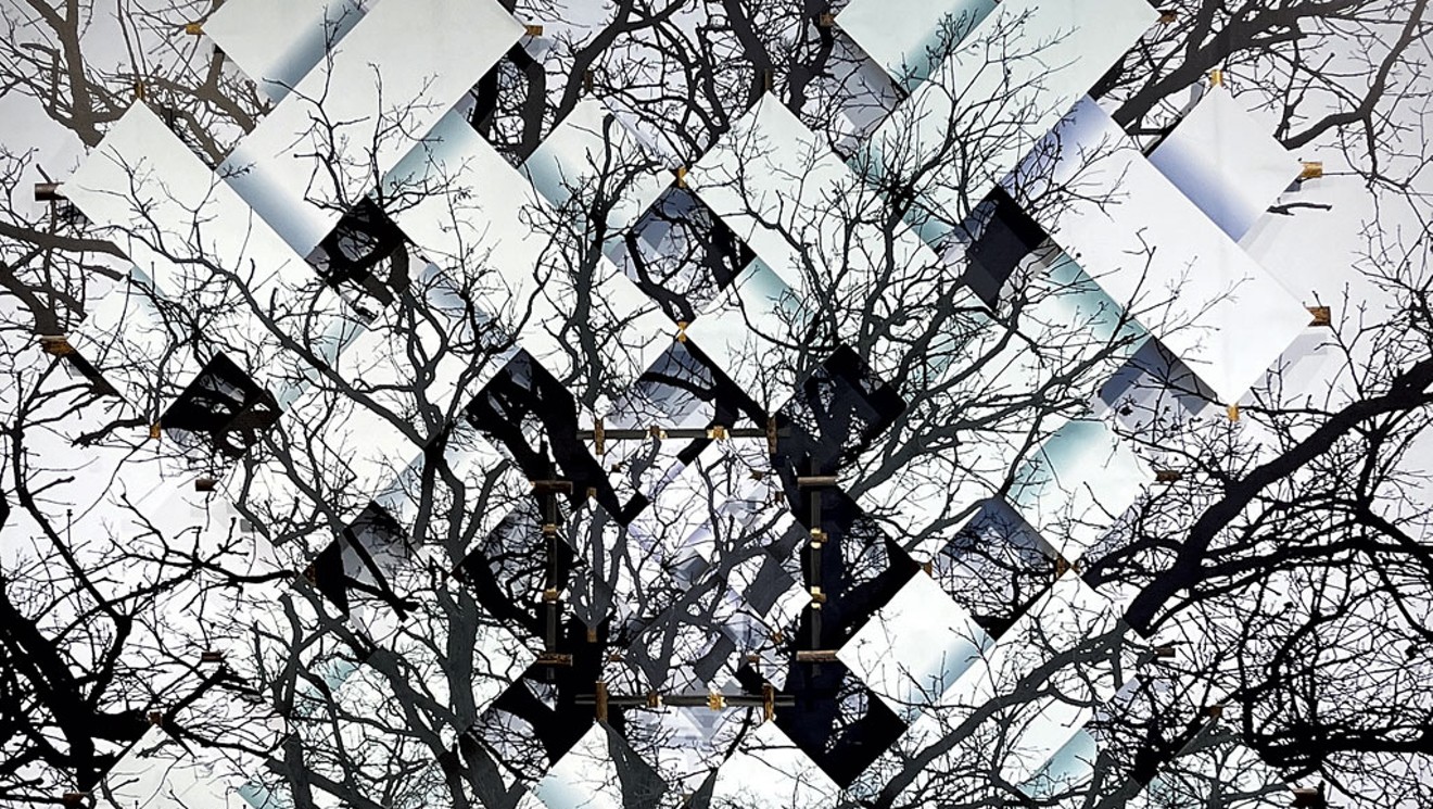 Colwell titled his exhibition “#Skylights,” in the manner of a hashtag, but that simple weave pattern long preceded the social media signifier. Here, the crossbar shape is the basis for the Ripton artist’s two- and three-dimensional constructions, singly or in combination. That is, he cuts and overlaps equal-size strips of Epson watercolor paper printed with photos of treetops, sunsets or clouds, then attaches them to a featherweight infrastructure of bamboo, or “bones.”