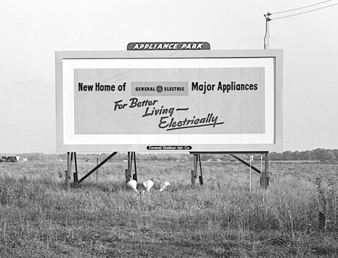 The first “sign” of the coming of Appliance Park was a billboard located on the farmland running parallel to Shepherdsville Road in 1950. (Photo: Elfun Historical Society, 1987, A Walk Through the Park)