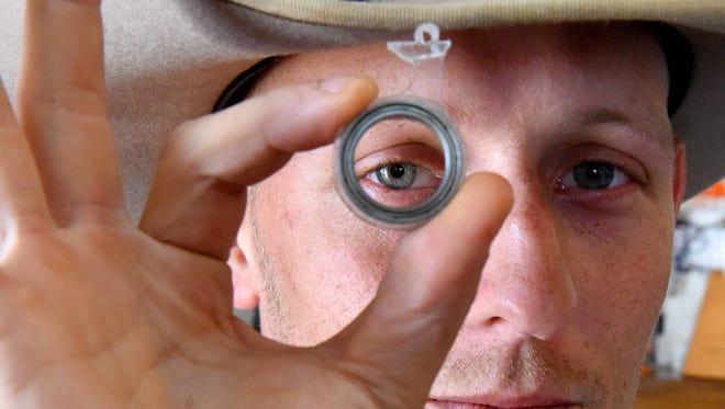 Local inventor Josh Lotts holds the 'ZRO trigger' he invented to be used with certain RC vehicle controllers  during an interview at Staunton Makerspace on Wednesday, Dec. 9, 2015.