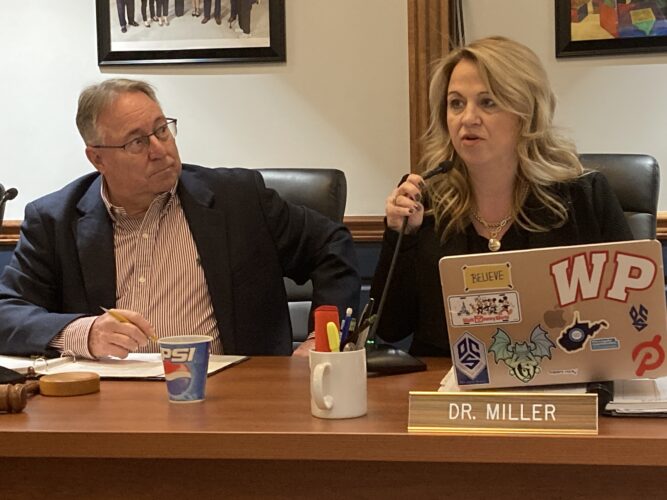 Ohio County Board of Education President Andy Garber, left, and Superintendent Kim Miller discuss data during Monday night’s board meeting.