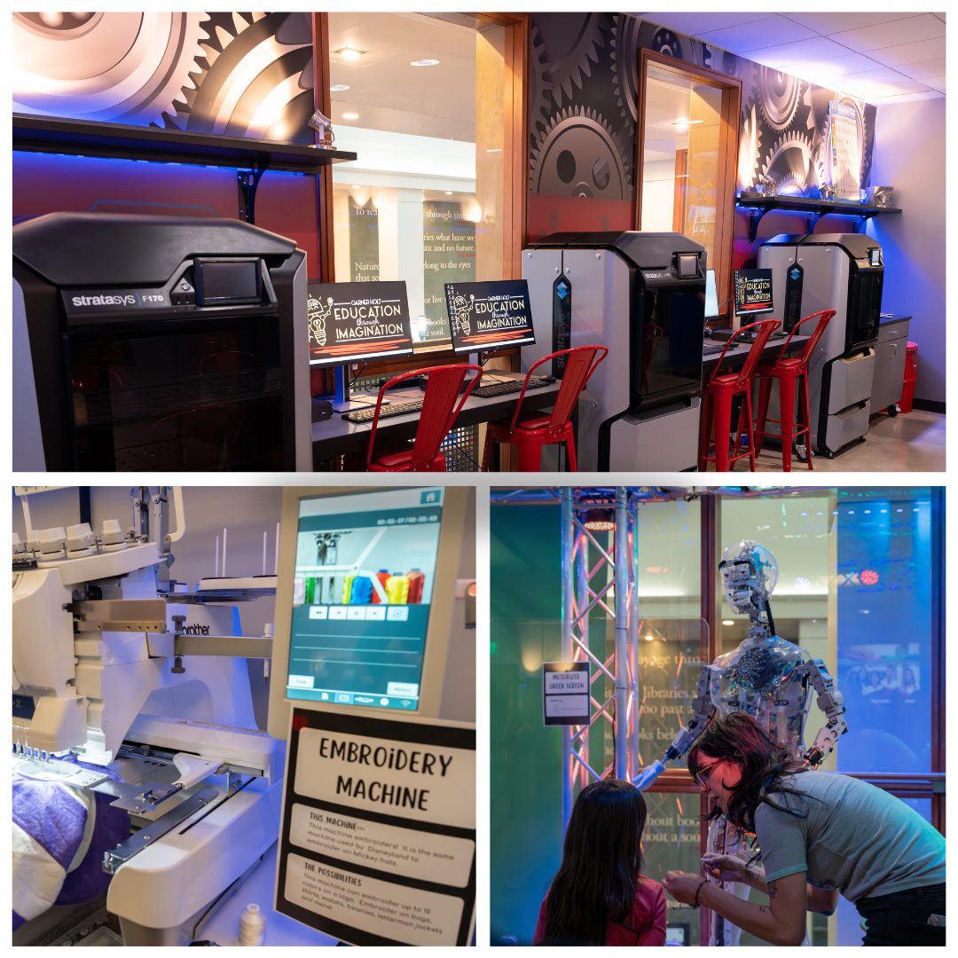 A vibrant makerspace featuring 3D printers, an embroidery machine, and a humanoid robot. Red chairs add a lively touch, conveying creativity and innovation.