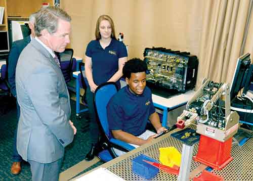 Brookfield High School student Uriah Pinchot, 17, seated, demonstrates the robotic arm that he programmed to Ohio Lt. Gov. Jon Husted, left, and robotics teacher Josy Kirila, look on during a tour of the high school Monday. It was Husted’s first stop to mark the start of In-Demand Jobs Week, a statewide celebration of jobs, skills and industries that are in demand in Ohio.