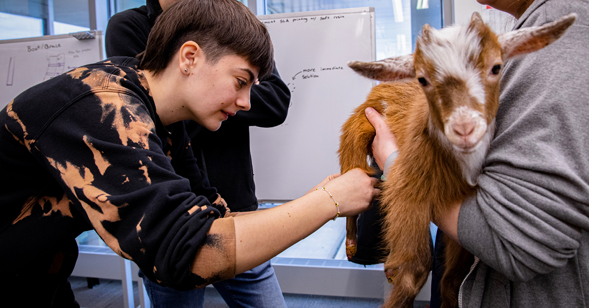 In the spring, Addison Deckert and Vince Gallo accepted a challenge from Dr. Matthew Edson, founding dean of the Shreiber School of Veterinary Medicine, to develop prosthetic hind legs for the goat.