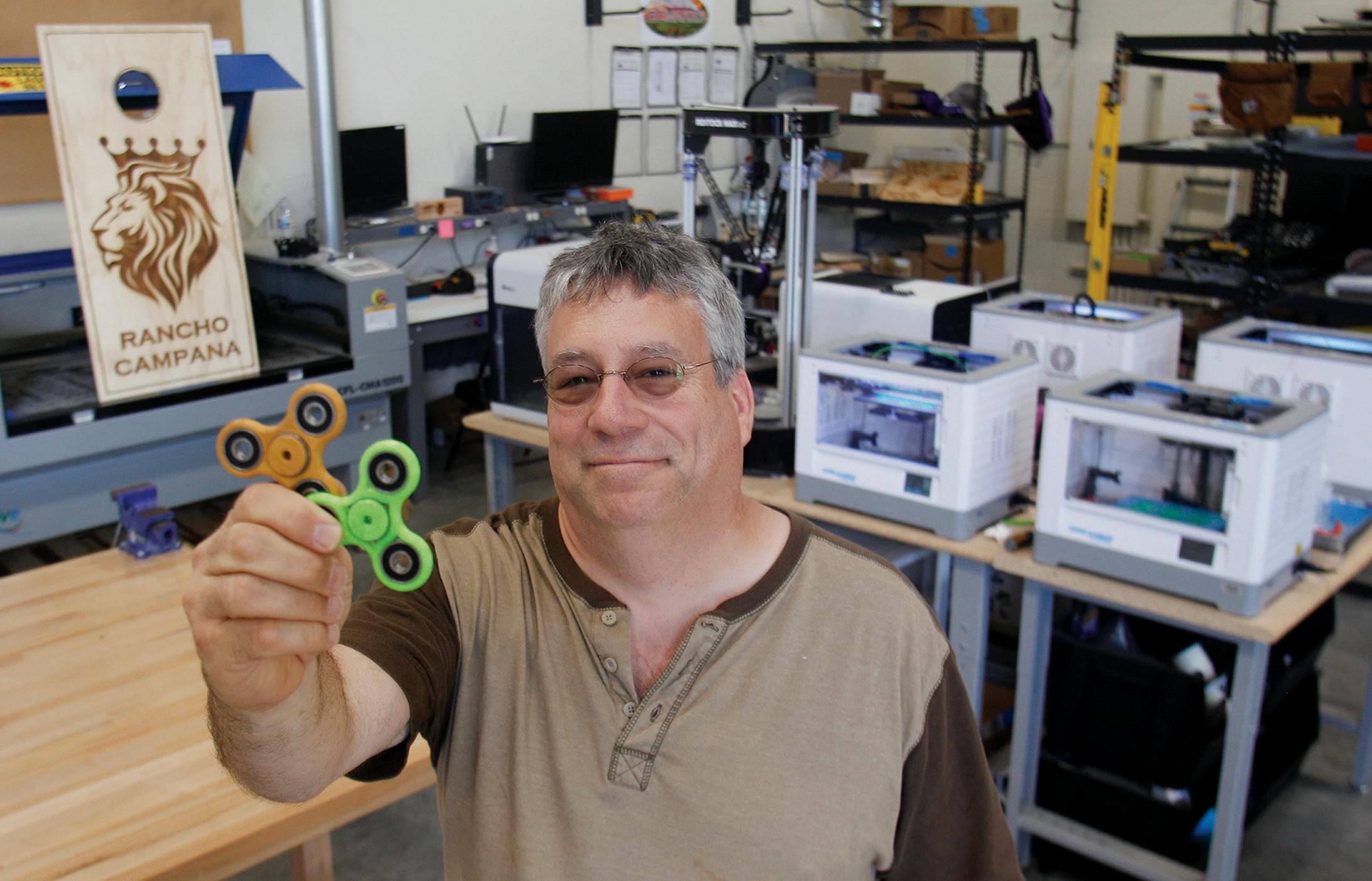 MANUFACTURED GOODS—Dave Gross, who donated $250,000 to Rancho Campana High School’s makerspace, holds some of the fidget spinners that students make in the high-tech workshop.