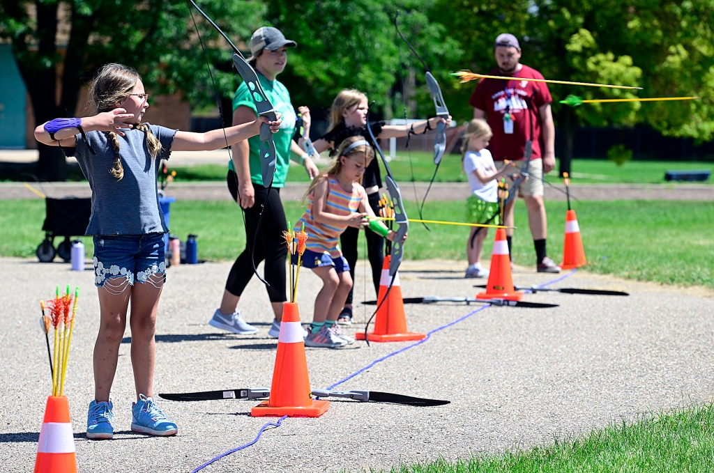 Vintage Valdez, 8, left, shoots her arrow while learning about archery Monday during a Y summer day camp at the former Mary Blair Elementary School in Loveland. (Jenny Sparks/Loveland Reporter-Herald)