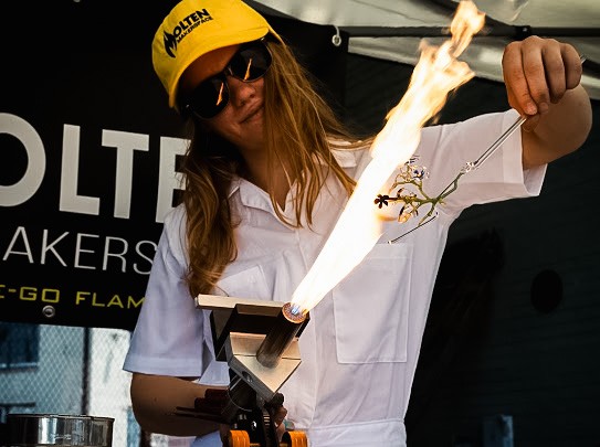 I started in my career as a glassblower. During the pandemic, I was unable to use the studio. I really wanted to gain skills that would keep me employed through any future crises, and so I decided to earn my welding certificate! The way molten metal moved was so similar to molten glass. After working as a welder for 2 years, my artistic side needed to be nourished. When I realized there was no glassblowing education or opportunities in my new city of Greensboro, I decided to change this. My love of the molten arts led me to the name: Molten Makerspace.