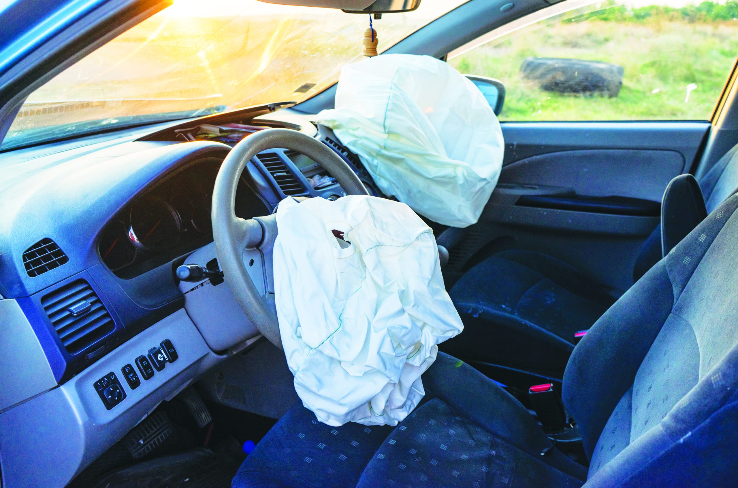 Burgas, Bulgaria – 07282021: Car after a strong side impact to the front end in a car accident. Deployed front airbags in the car