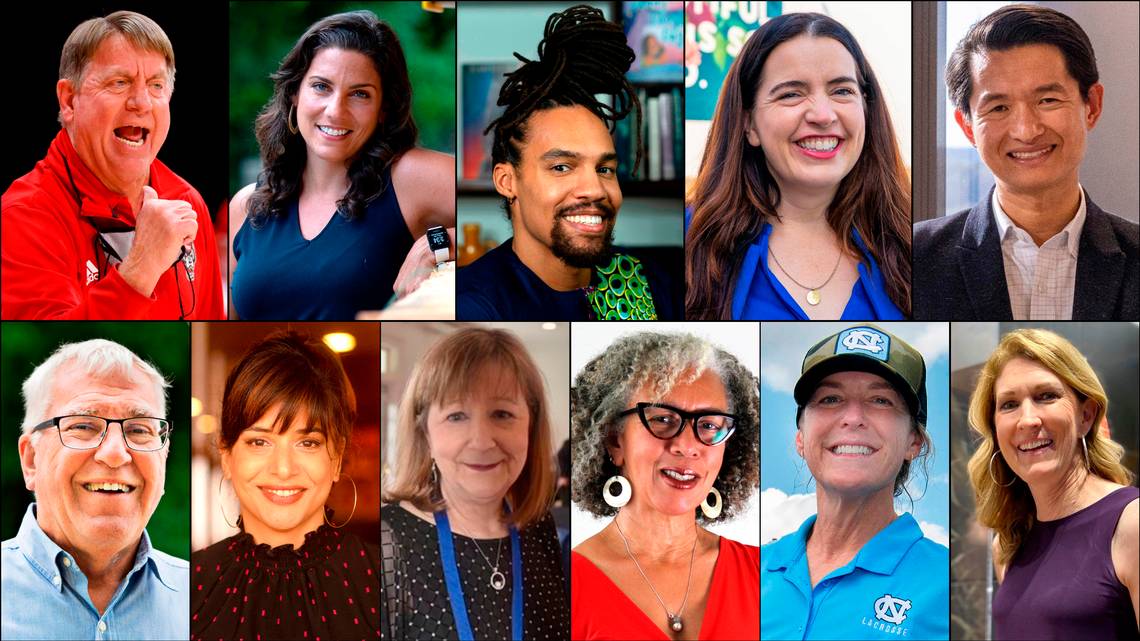 Tar Heels of the Month for 2022 included, clockwise from top left, Wes Moore, Nora El-Khouri Spencer, Pierce Freelon, Kate Bowler, Christopher Chung, Debbie Antonelli, Jenny Levy, Carole Boston Weatherford, Pam Kohl, Cheetie Kumar and Tim Stevens.