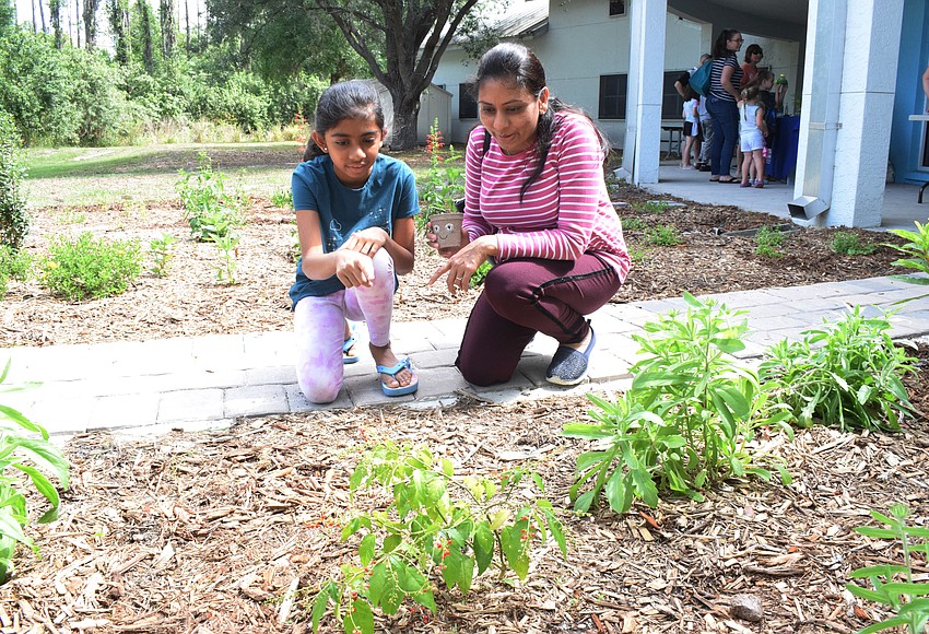 Bradenton’s Rita Patel kneeled next to her daughter Aarna Patel to look at the plants in the Braden River Library’s new sensory garden.