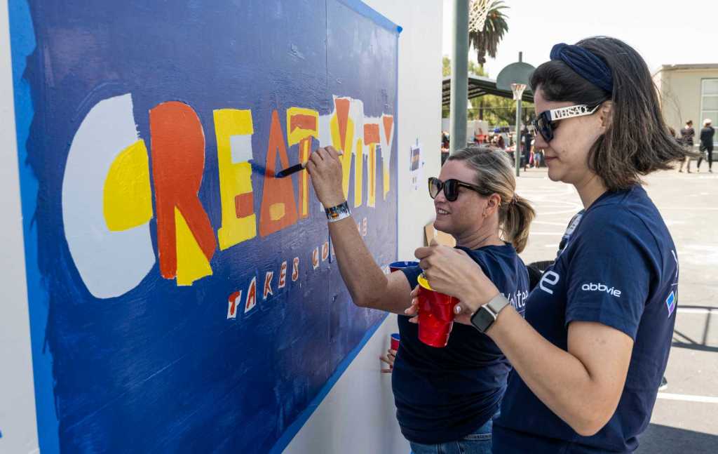 AbbVie volunteers Erin Manning and Elaheh Shirneshan, from left, paint a “Creativity Takes Courage” mural on the playground at Edison Elementary School in Santa Ana, CA on Monday, June 26, 2023. AbbVie partnered with Heart of America to beautify the campus and create STEM (science, technology, engineering and mathematics) learning classrooms. (Photo by Paul Bersebach, Orange County Register/SCNG)