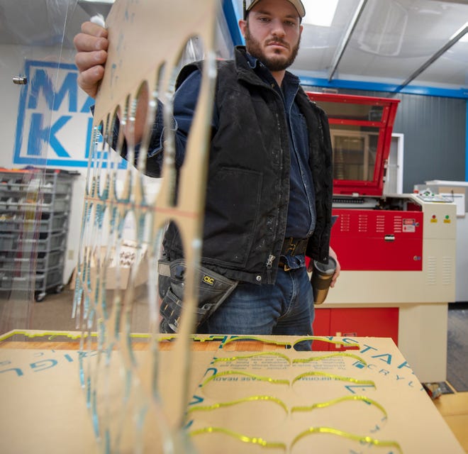 Issac Tucker, director for Katapult and a member of Dillsburg borough council with the laser cutouts from a project at the Libratory in Dillsburg Monday February 18, 2019.