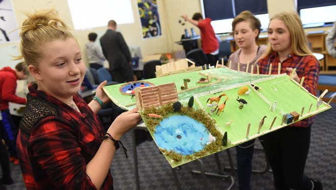 South Eastern Middle School seventh graders from left clockwise: Genevieve Cully, Emma McCarthy and Beyonce Hannigan carry their civilization project through the school library on Thursday. The trio were working on the project in the makerspace area created in the library which encourages a more creative atmosphere.