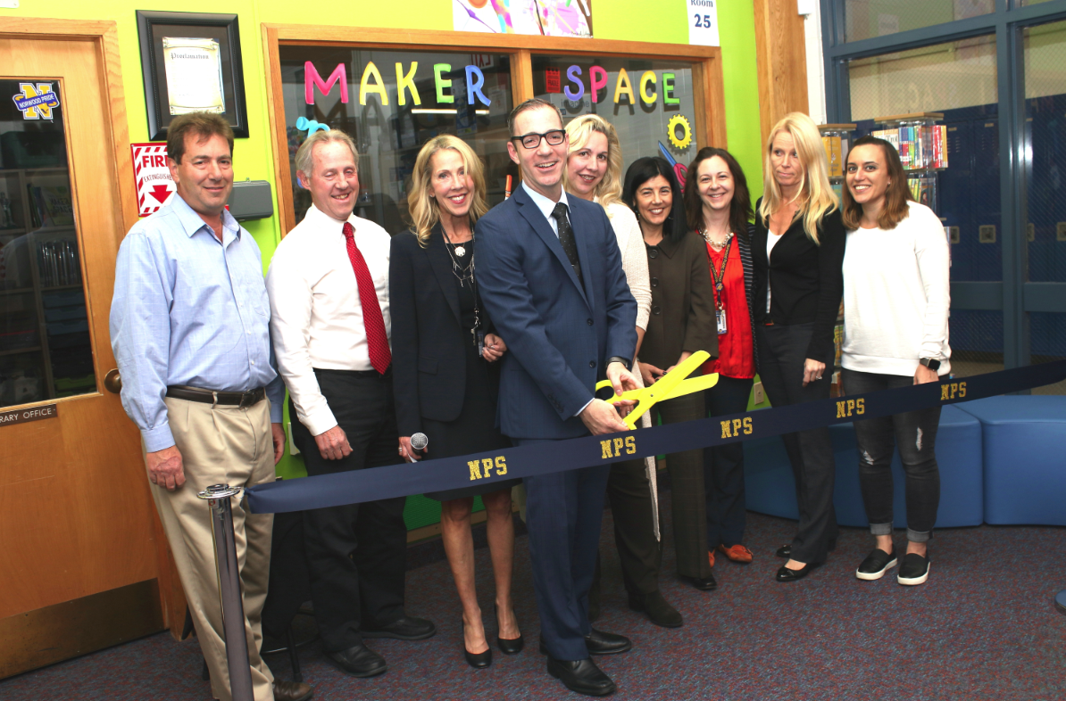 Norwood Mayor James Barsa, Board of Education President Michael Sprague, Superintendent Lisa Gross, Principal Vito DeLaura Jr., PTO President Kate Cerbasi and committee members welcome the Makerspace at a ribbon-cutting ceremony on Nov. 6.