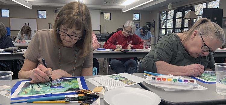 From left to right are Lottie Smith, Angela Congdon and Cheryl Shepherd, who took part in a Fulton County Public Library Makerspace workshop demonstrating how to source royalty-free photo references online and edit them using Adobe Photoshop. Participants then used an edited photo to create a watercolor painting using traditional materials. Photo provided by Erica Coffing.