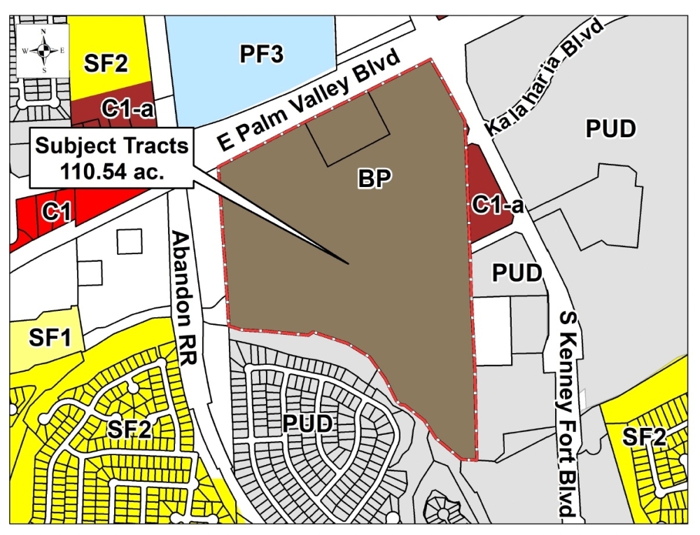 The 110.54 acre tract of land at the intersection of E. Palm Valley Boulevard and S. Kenney Fort Boulevard has been recommended for rezoning to urban style mixed use by the Round Rock Planning and Zoning Commission. (Courtesy City of Round Rock)