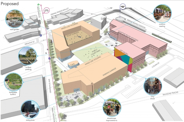 The mixed-use redevelopment planned by Detroit-based Sturgeon Bay Partners calls for 753 apartment units across three buildings, commercial space, a cafe and a five-story parking garage. The development at 446 Grandville Ave. SW in the city’s Roosevelt Park neighborhood comprises nearly the entire block where the furniture company operated from 1880 to the early 1930s, according to the Grand Rapids Historical Commission.