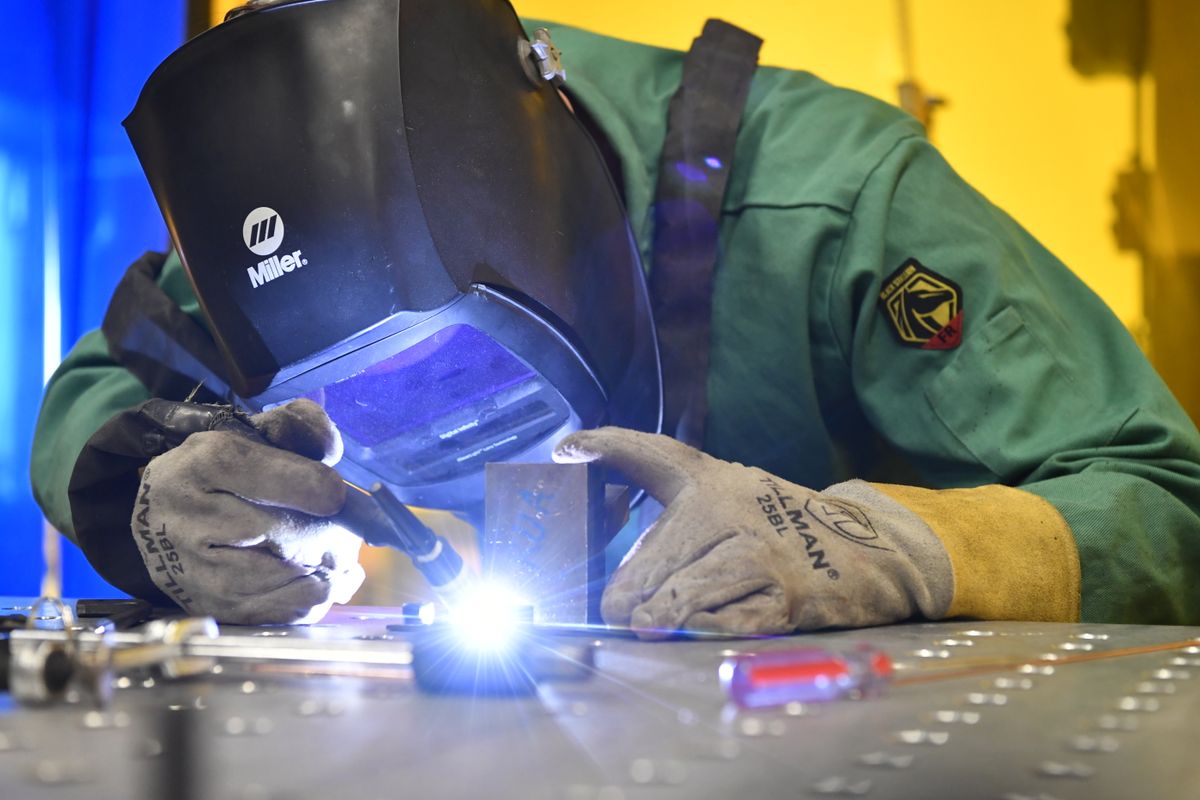 A student uses welding tools inside the WVU Lane Innovation Hub, a 9,500-square-foot industrial space on the Evansdale Campus where students, faculty and staff can design, build and fabricate anything they can conceptualize.