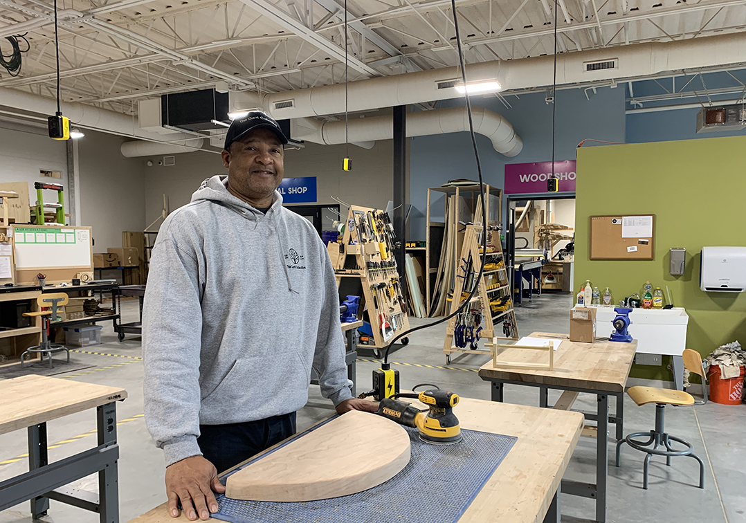 Michael Gant stands in his workshop area at the Maker Playground at Hub & Spoke in Fishers. (Photo by Rebecca Fending)
