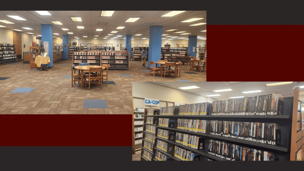 This media area, which is downstairs at the library, was once the most popular in terms of circulation, averaging over 1000 copies checked out each month according to Collection Management Librarian, David Scott. This popularity helped grow the collection to “somewhere in the neighborhood of 8 of 9 thousand DVDs.” one of the larger collections for library this size in the State.